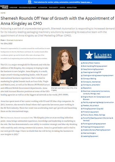 PRO FOOD WORLD (PMMI): Shemesh Appoints Anna Kingsley As New CMO